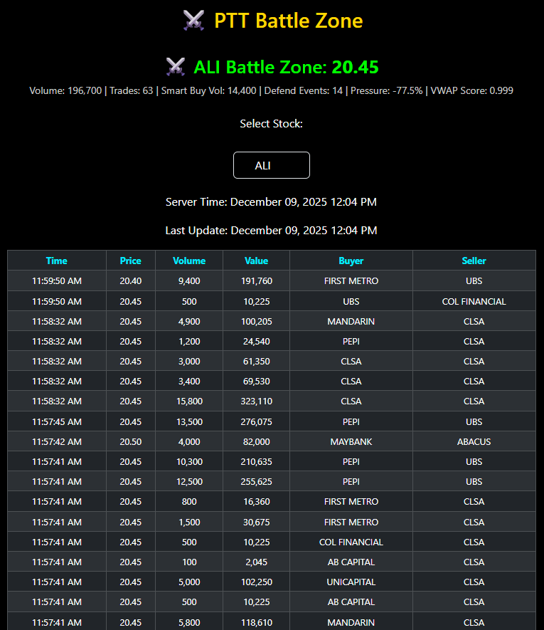 The PTT Battle Zone tool answers these questions by analyzing real-time trades, smart-broker behavior, and repeated absorption patterns.